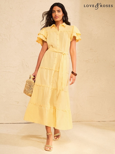 檸檬黃 - Love & Roses Cotton Ric Rac Trim Shirt Midi Dress