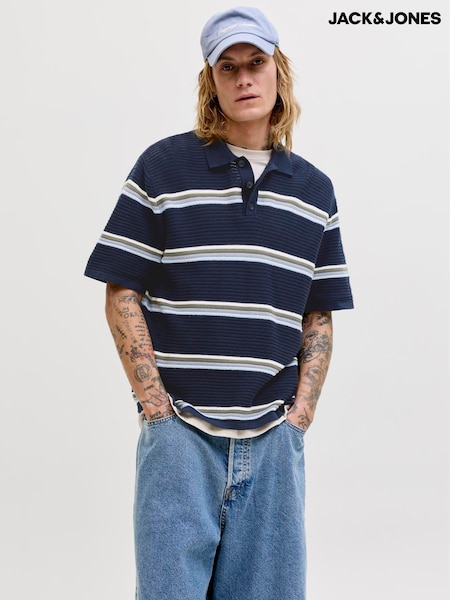 JACK & JONES Blue Relaxed Fit Stripe Knit Polo Shirt