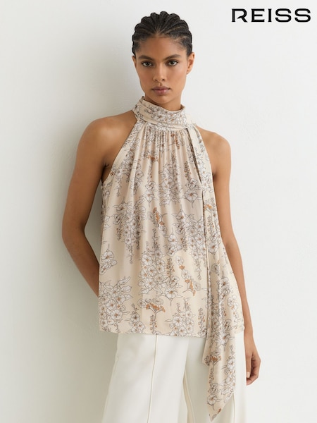 Reiss Cream Josie Floral-Print Scarf-Neck Top