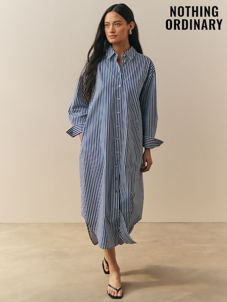 Nothing Ordinary Blue/White Stripe 100% Cotton Poplin Midi Shirt Dress