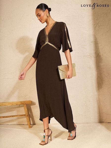 Love & Roses Chocolate Brown Petite Sequin Trim Hanky Hem Midi Dress