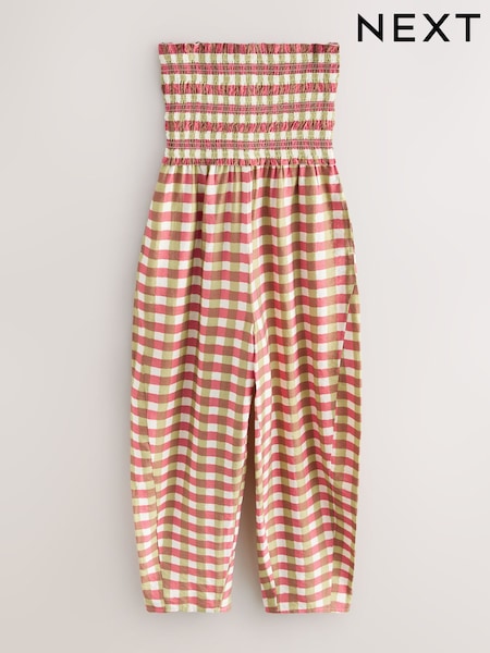 Pink Green Gingham Check Bandeau Shirred Body Barrel Leg Jumpsuit