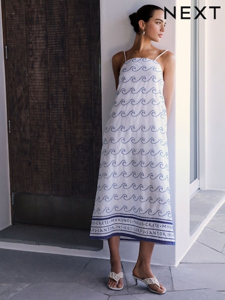White/Blue Wave Print Square Neck Cami Midi Dress