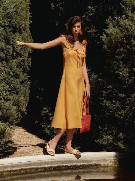 BHOEM Orange Linen Blend Frill Detail Straps Midi Dress