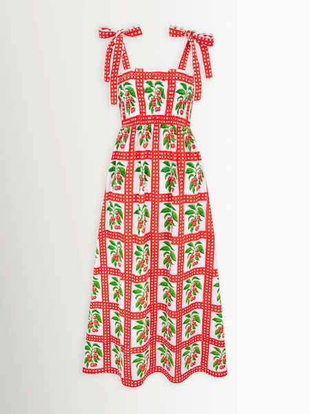 Love & Roses x RHS Red Cherry Print Smocked Bodice Puff Sleeve Midi Dress