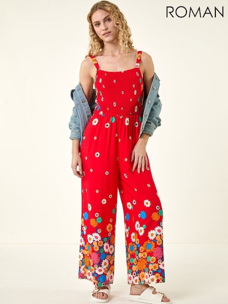Roman Red Floral Border Print Shirred Jumpsuit