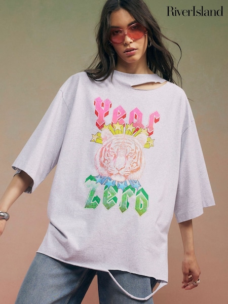 River Island Grey Short Sleeve Year Zero Rip Detail Oversized T-Shirt