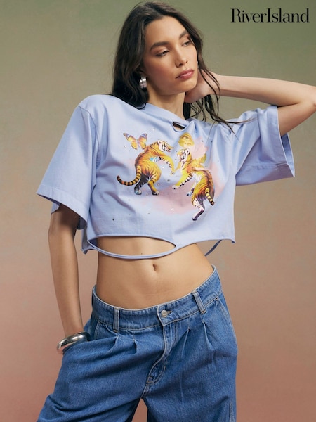 River Island Blue Short Sleeve Year Zero Cropped Rip Detail T-Shirt