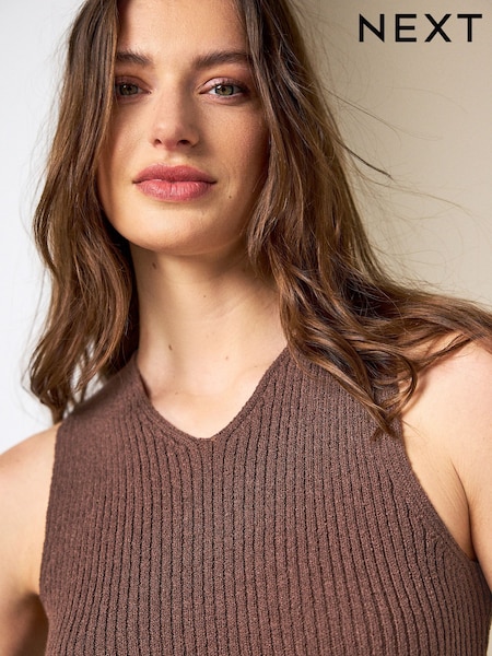 Chocolate Brown Towelling Knit V-Neck Vest Top