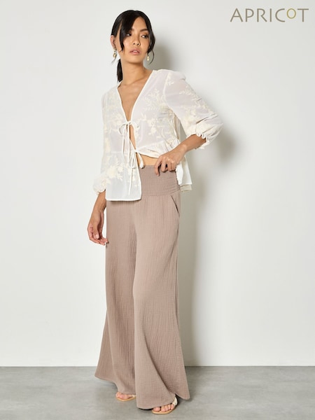 Apricot Brown Textured Cotton Wide Leg Trousers