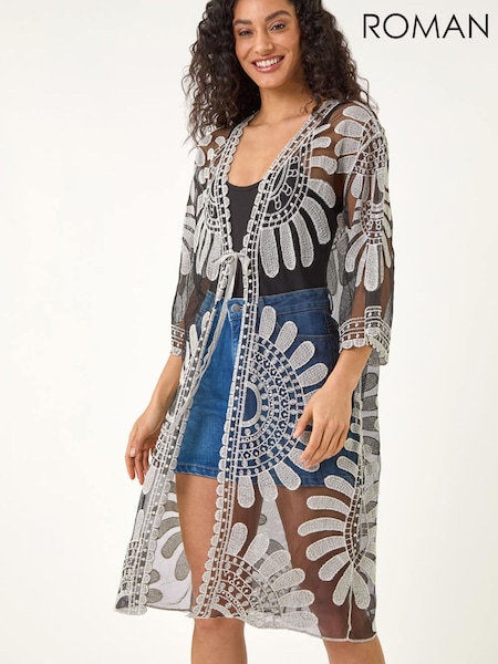 Roman Black Floral Crochet Lace Kimono