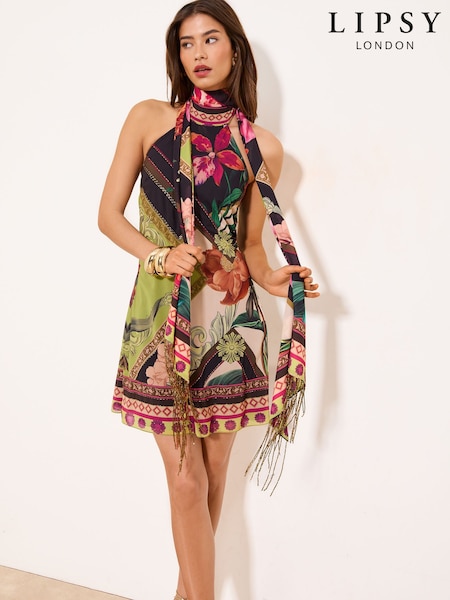 Lipsy Black Embrodiery Fringe Scarf Swing Mini Dress