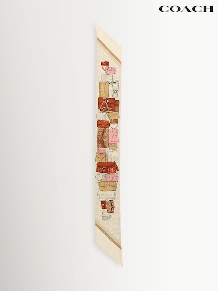 COACH White Stacked Tabby Printed Wide Silk Skinny Scarve