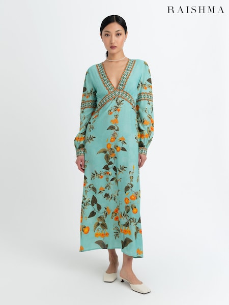 Raishma Blue Elsa Is A Sophisticated Midi Dress Featuring A Deep V-Neckline Long Statement Sleeves And A Flowing Silhouette