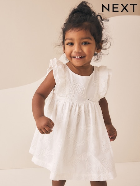 White Embroidered Linen Frill Sleeve Dress (3mths-8yrs)