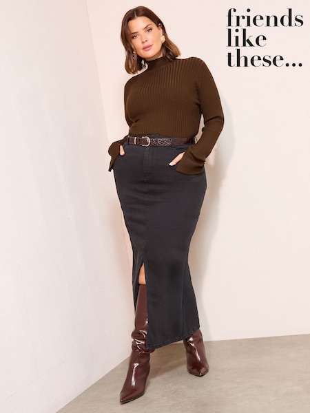 Friends Like These Black Curve Split Front Denim Midi Skirt