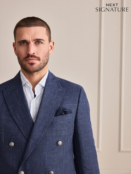 أزرق داكن أزرق - Signature 100% Linen Textured Double Breasted Blazer