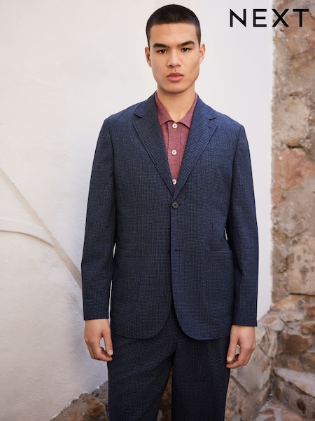أزرق داكن - Relaxed Fit Wool Blend Gingham Check Suit Jacket