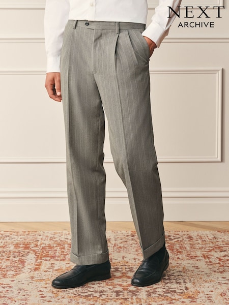لون محايد - Archive Pleated Striped Wool Blend Suit Trousers