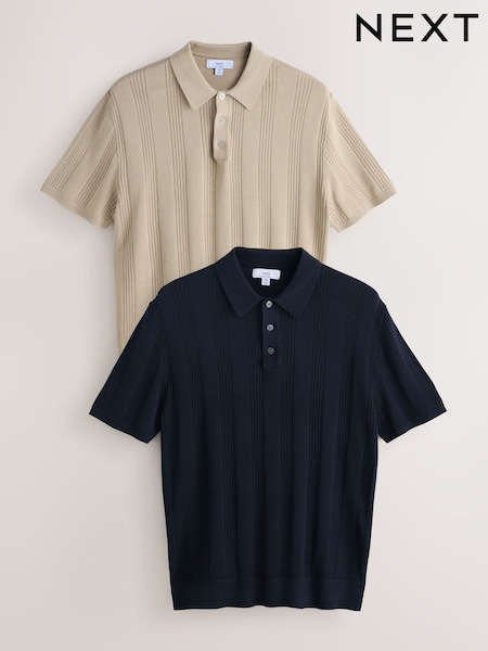 Neutral/Navy Blue Regular Fit Cotton Rich Pointelle Stripe Short Sleeve Knit Polo Shirts 2 Pack