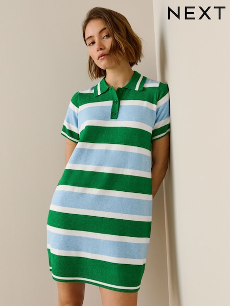 Green/Blue Stripe Supersoft Short Sleeve Knitted Mini Polo Dress