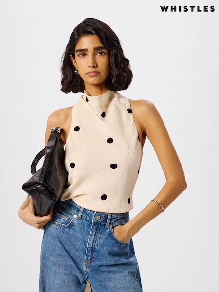 Whistles Cream Jacquard Spot Satin Halterneck Top