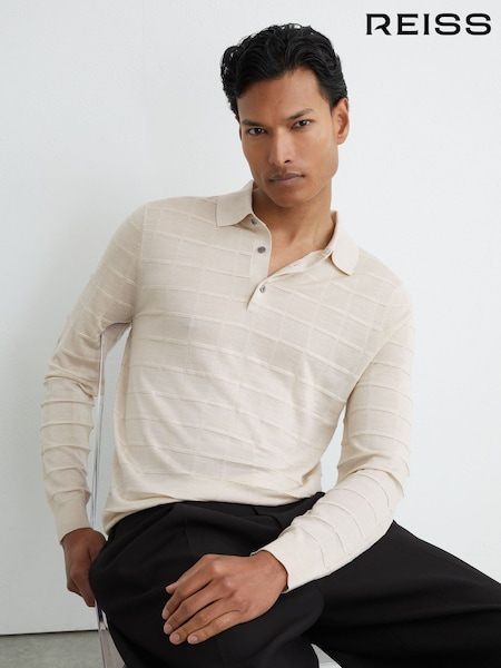 Reiss Ecru Pallas Check-Texture Long-Sleeve Polo Jumper with Wool