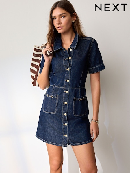 Rinse Blue Short Sleeve Gold Buckle Pocket Mini Denim Dress