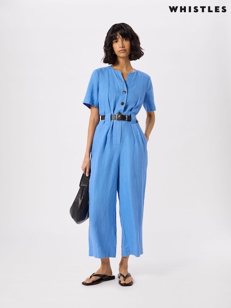 Whistles Blue Petite Fiona Linen Button Jumpsuit