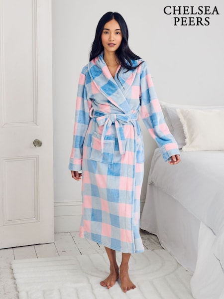 Chelsea Peers Blue Fleece Embroidered Back Do Not Disturb Check Dressing Gown