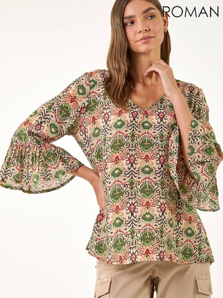 Roman Ikat プリントフレアスリーブトップ