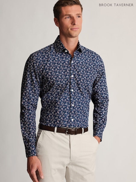 ブルー - レギュラーフィット - Brook Taverner 花柄プリント ストレッチ コットンシャツ