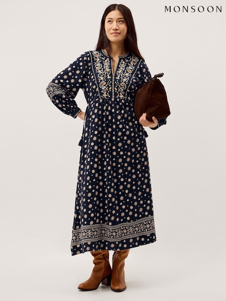 Monsoon Viv Velvet Trim 長袖 ミディワンピース
