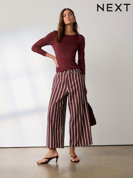 Brown Stripe Wide Leg Raw Hem Cropped Jeans