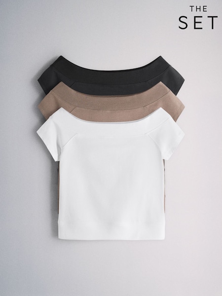 The Set 3 Pack Off Shoulder Tops Black Brown/White