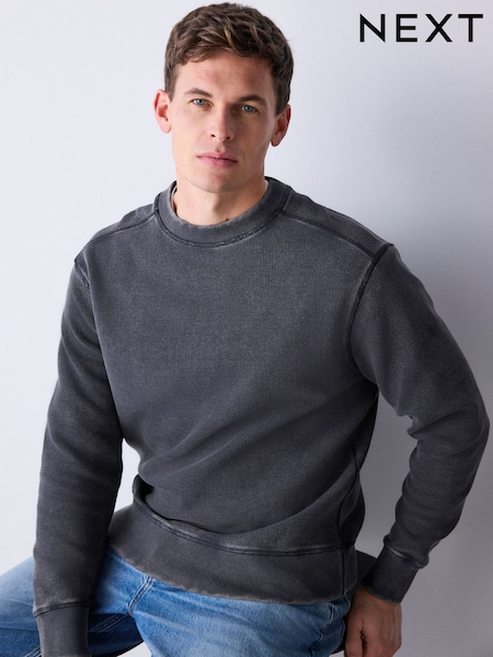 Black Garment Wash Boxy Fit Waffle Textured Crew Neck Sweatshirt