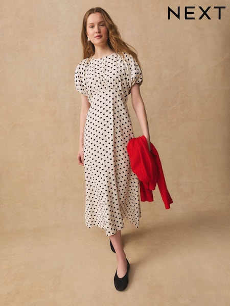 Ecru / Black Polka Dot Puff Sleeve Midi Dress