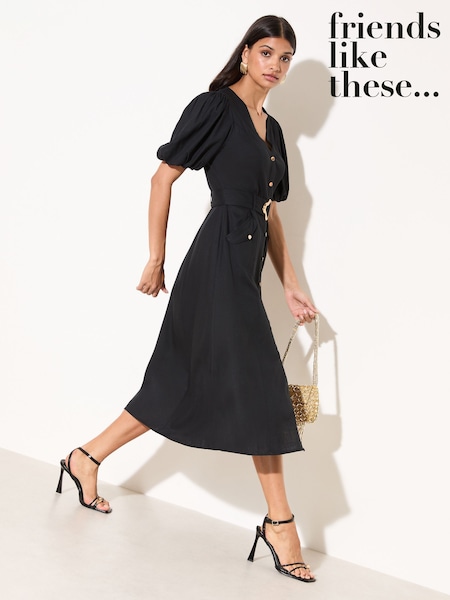 Friends Like These Black Curve Button Through Belted Midi Dress