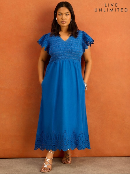 Live Unlimited Blue Broderie Shirred Midi Dress