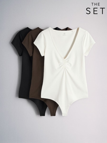 The Set 3 Pack Cap Sleeve Ruched Front Bodysuits Black/Chocolate Brown/Cream