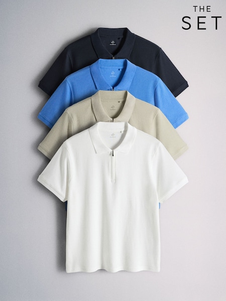 The Set 4 Pack Navy/Blue/White/Khaki Textured Cotton Zip Neck Polos Blue/Ecru