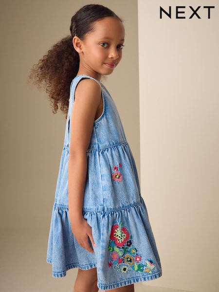 Blue Denim Embroidered Tiered Dress (3-16yrs)