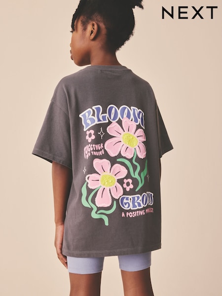 Charcoal Grey Floral Oversized Graphic Sequin T-Shirt (3-16yrs)