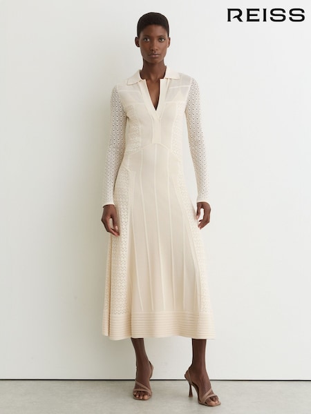Reiss Cream Lindy Pointelle-Knit Panelled Midi Dress