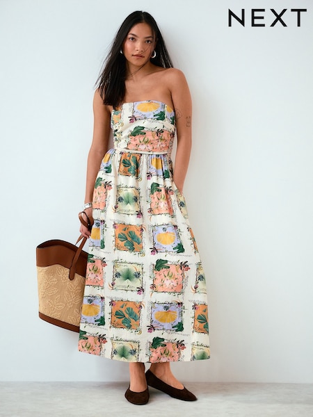 Ecru/Green Palm Print Ruched Bandeau Midi Dress with Linen