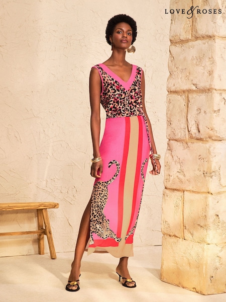 Pink Placement Stripe Animal Print - Трикотажное платье миди с V-образным вырезом Love & Roses
