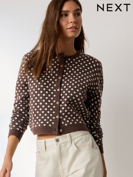 Коричневый в горошек - Круглый вырез вязаный кардиган
