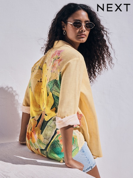 Желтый с тропическим принтом и вырезной отделкой - Рубашка свободного кроя с длинными рукавами из льна