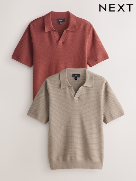 Red/Brown Textured Knit Short Sleeve Trophy Neck Polo Shirts 2 Pack