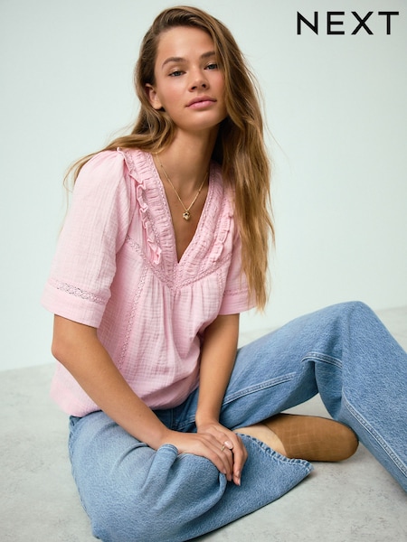 Scenic Print Flutter Sleeve Button Front Top With Linen
